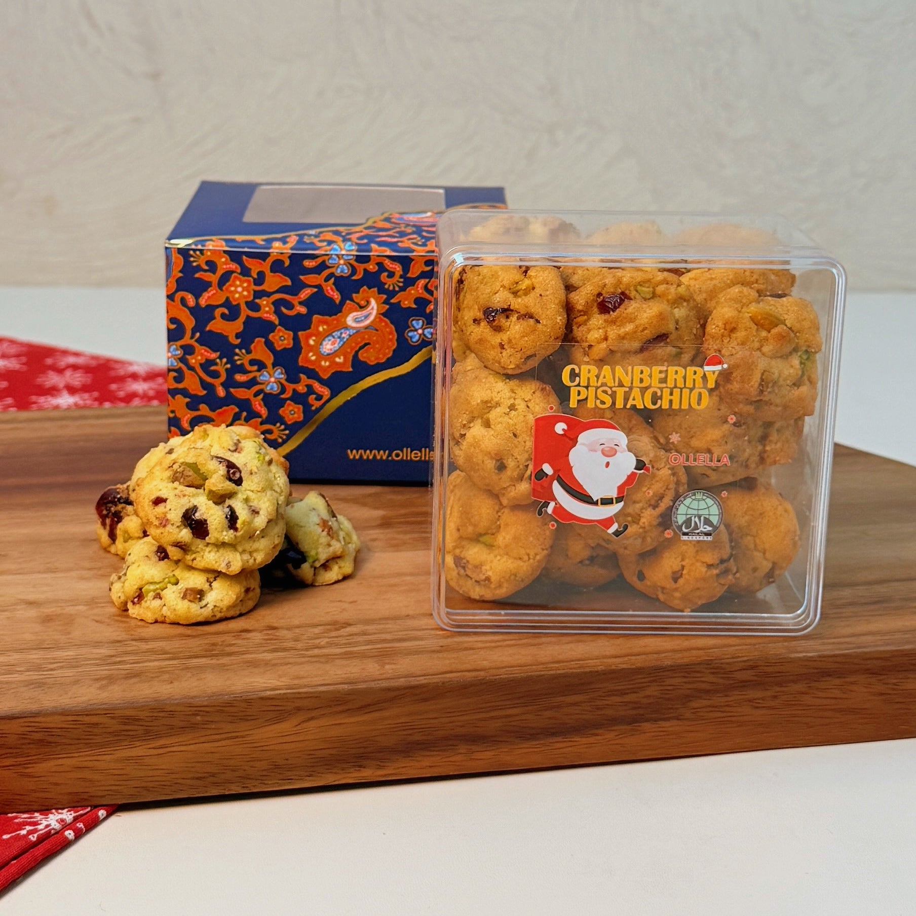 A beautiful balance of roasted pistachios and tart cranberries, baked to golden perfection. These cookies offer a harmonious mix of nutty crunch and festive sweetness — vibrant, colourful, and full of holiday cheer. All packed in a festive batik gift box (10x10x7cm).